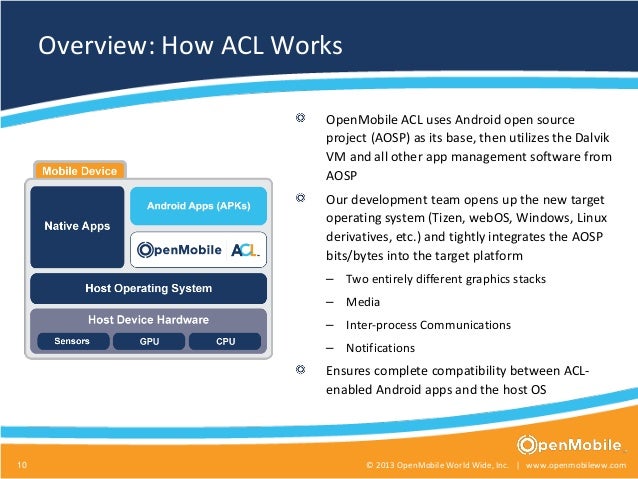 OpenMobile-Enabled App Ecosystem for Tizen Store OpenMobile acquired apps undergo initial curation, and enter OpenMobile's Validation Process. 2 1 To enable the Tizen–based device to run OpenMobilesupplied apps, “ACL for Tizen” is installed on the mobile device. Validated & curated apps and associated metadata are converted to Tizen format. Jan 14, 2015 According to Tizen Experts, Samsung’s first Tizen OS smartphone, the Z1, will launch with Open Mobile ACL android apps support. This means it will be able to run Android apps. This feat is said to be made possible using Open Mobile’s ACL Technology, which has tens of thousands of Android Apps as part of its catalogue.